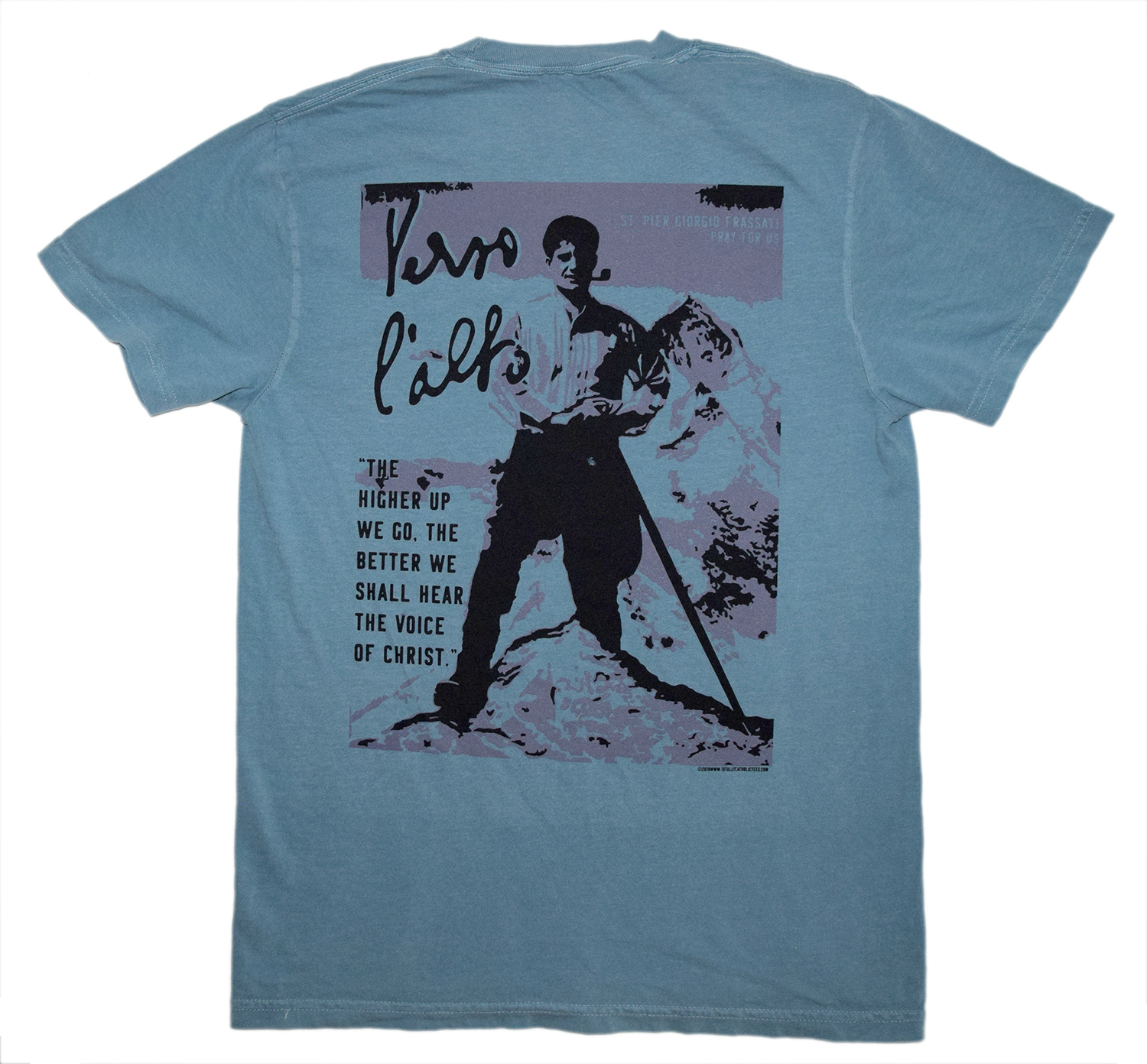 Verso L’alto!!!! ….Italian for “To the Heights!” The motto of Saint Pier Giorgio Frassati, the “man of the beatitudes”. On the back, a graphic image of the holy young man who had a heart for adventure, nature, the youth, and above all…God. St. Pier Giorgio Frassati, Pray for us! This Long-Sleeve shirt is perfect for your adventurous hiking trips into God's country!