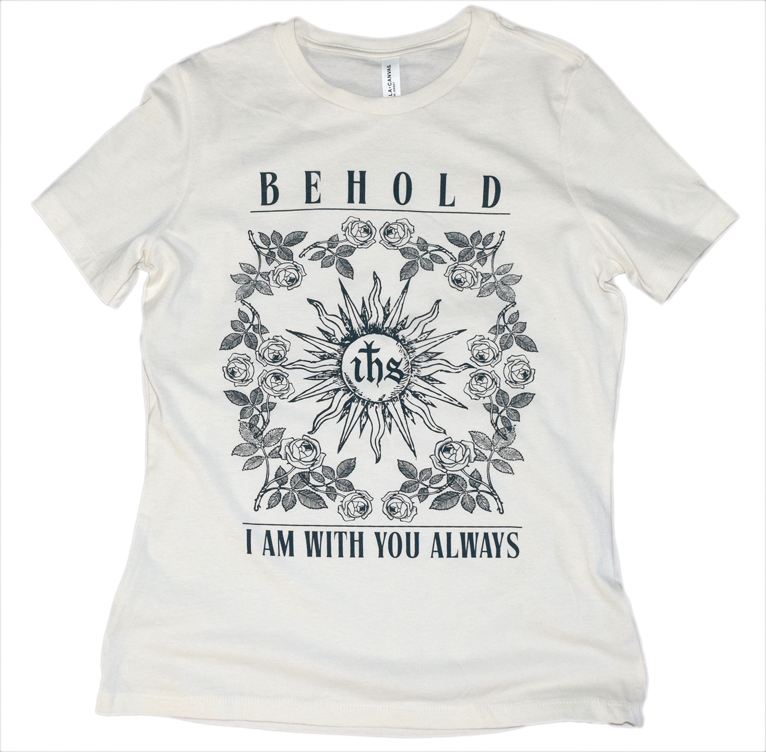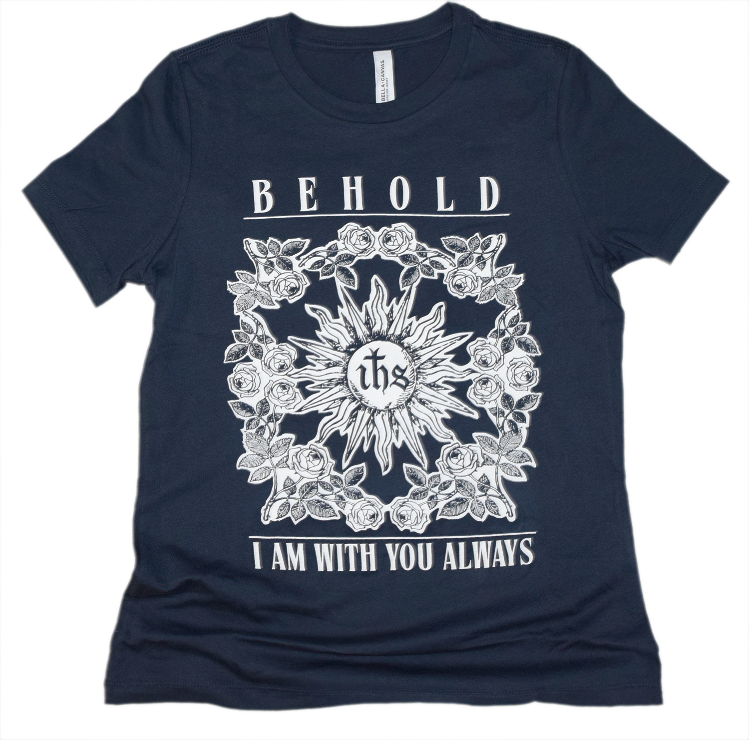 This beautiful shirt has "Behold, I am with you always". With a graphic of the Eucharist surrounded by roses. A reminder of Jesus' promise that He will be with us until the end of time.