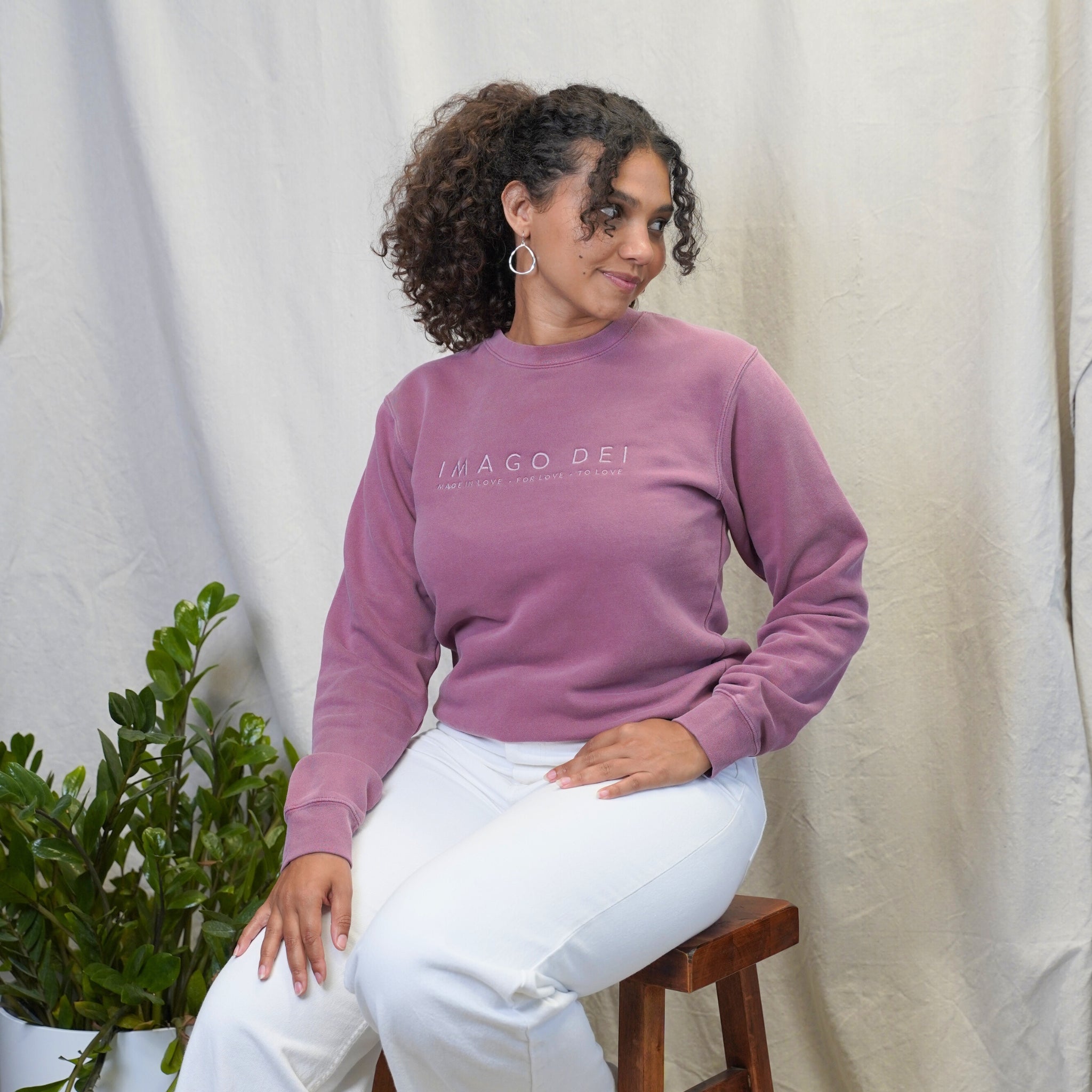 IMAGO DEI- Image of God, reminding us and the world we are made in God's own image, made in love, for love, and to love. A high-quality pigment-dyed crew in muted colors with a tone-on-tone embroidery. Subtle but powerful.