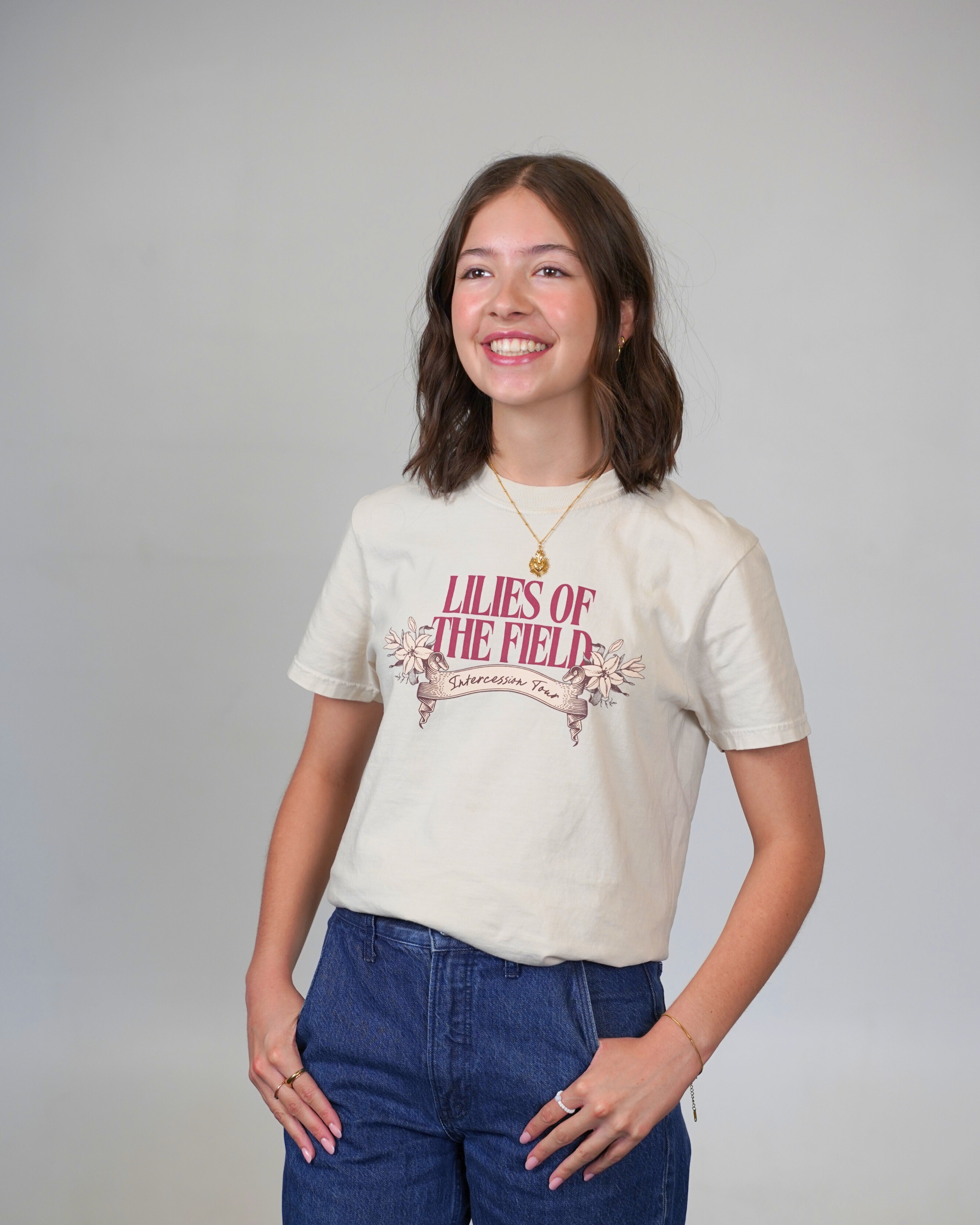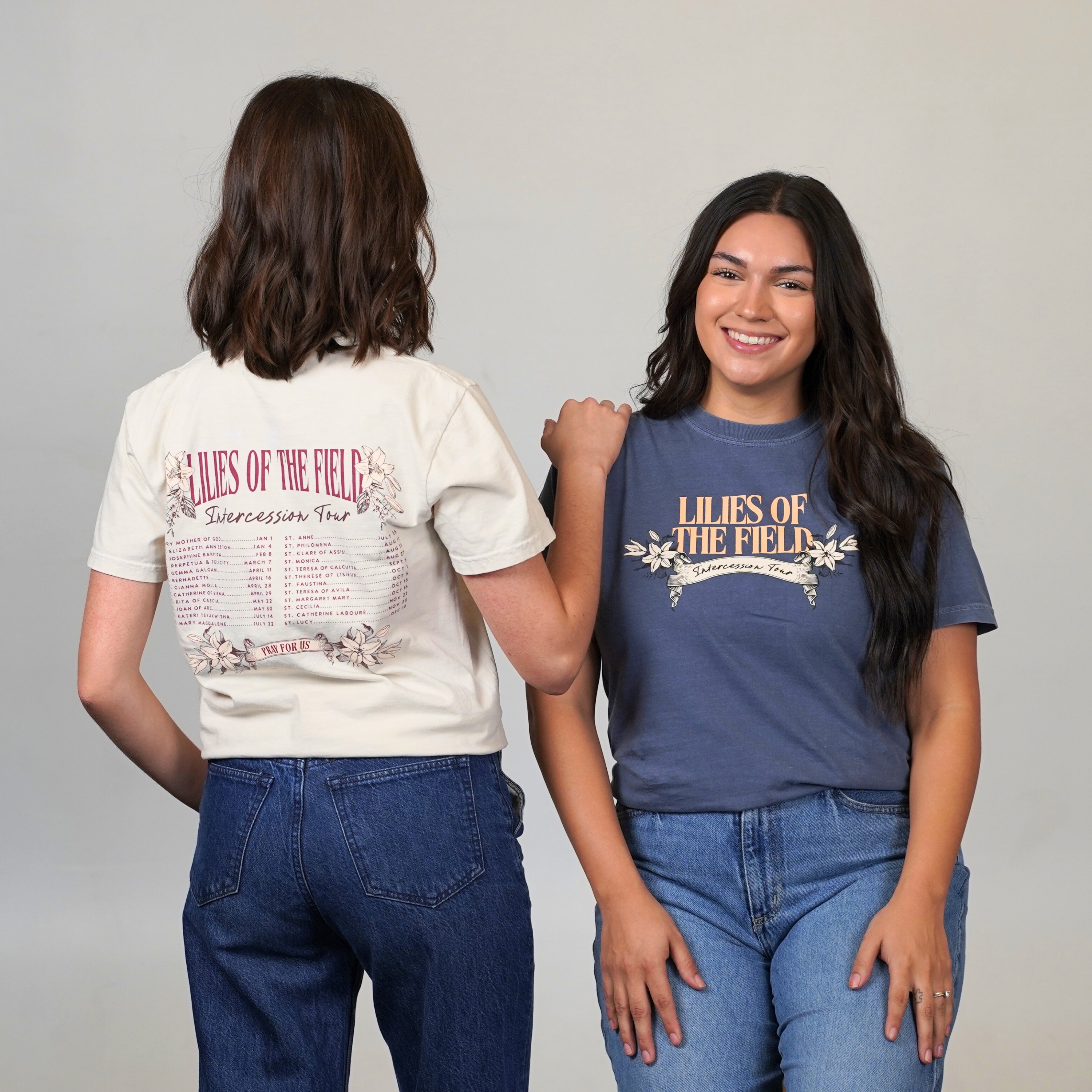 Styled after retro concert-style tees. This Lilies of the Field, "Intercession Tour" tee hits in all the right places! A list of many wonderful women saints on the back with their feast days starting with, of course, Mary- Mother of God! Great colors and softness, perfect to wear oversized or just with your favorite pair of boyfriend jeans!